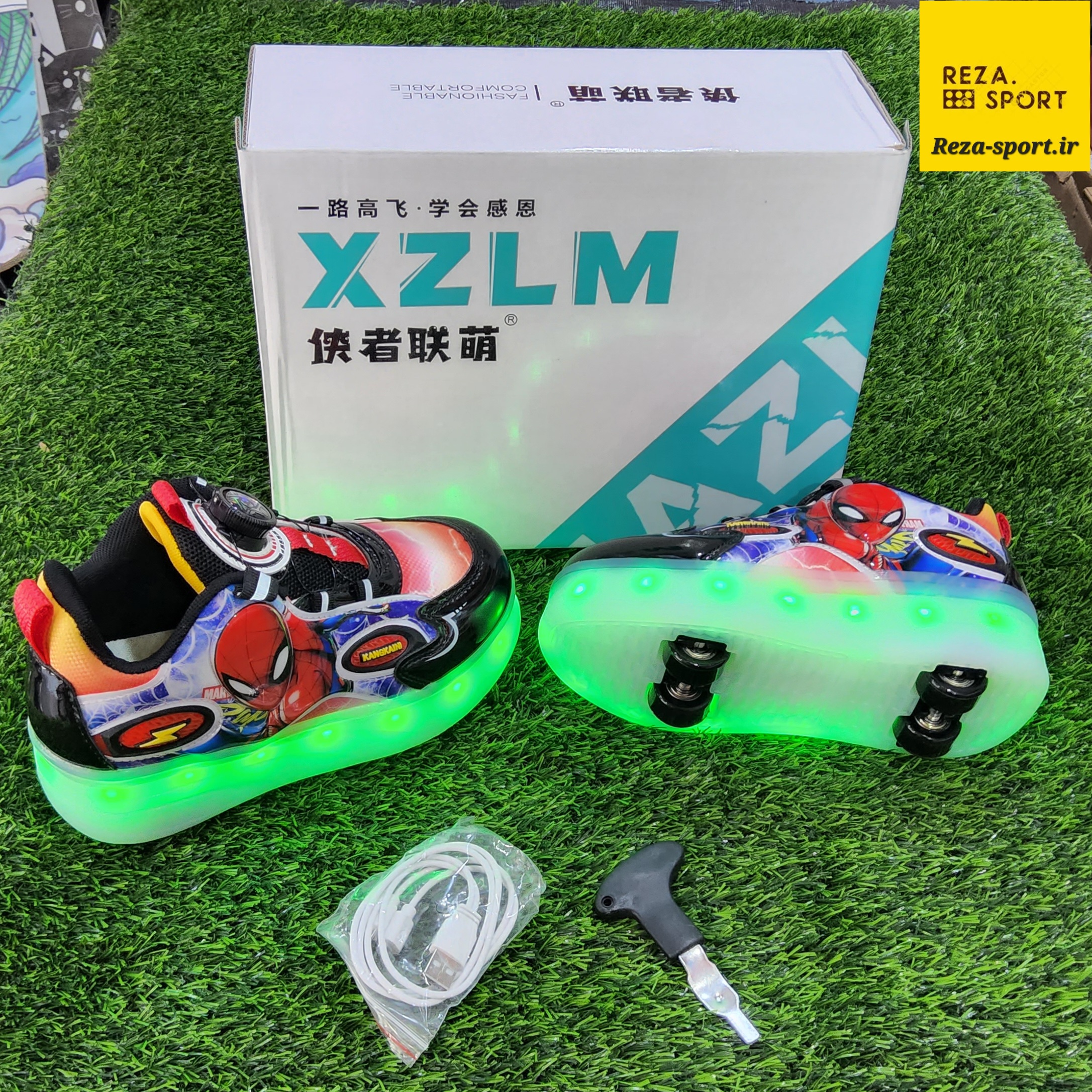 کفش اسکیتی چراغ دار وارداتی طرح مرد عنکبوتی چهارچرخ سایز ۲۸ تا ۳۵