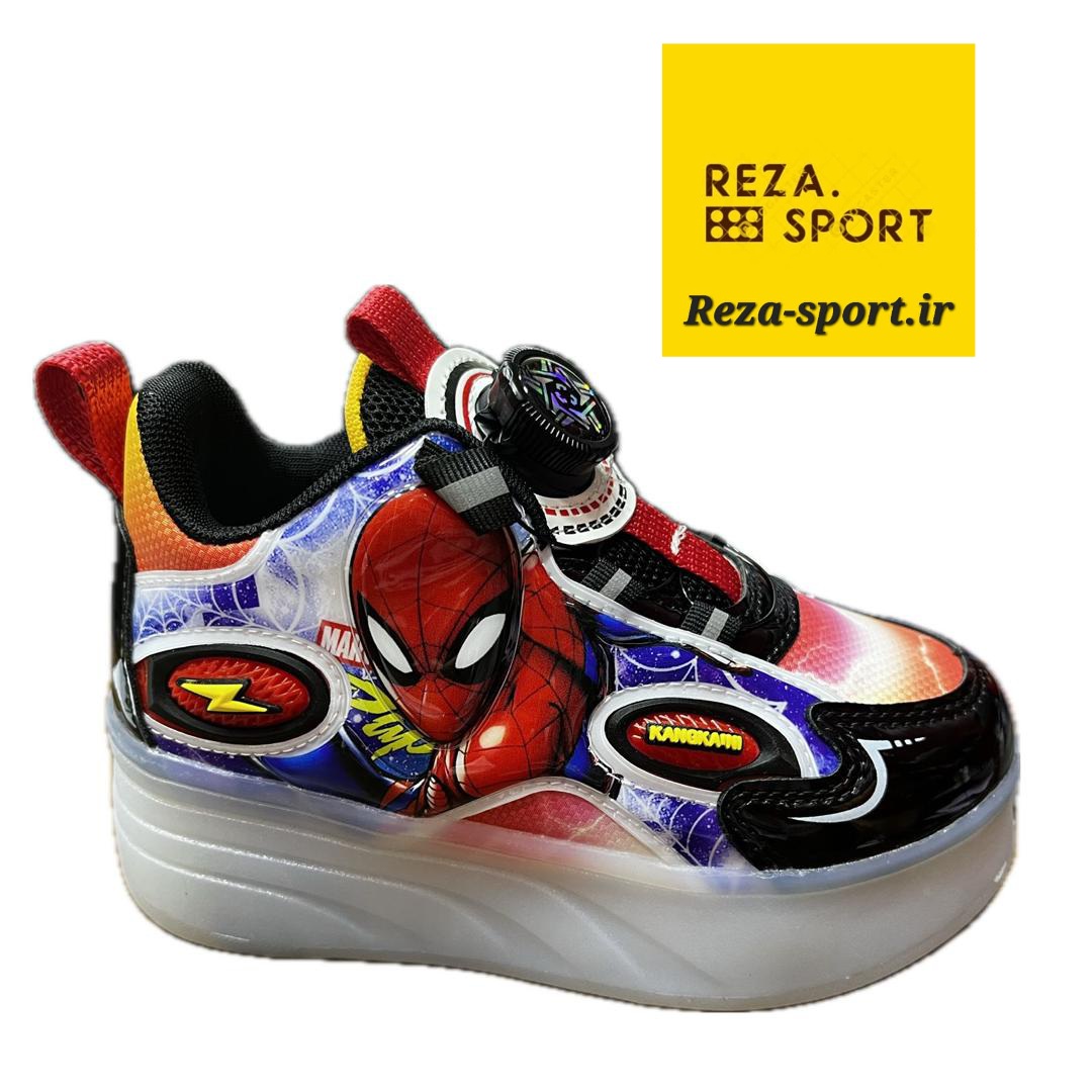 کفش اسکیتی چراغ دار وارداتی طرح مرد عنکبوتی چهارچرخ سایز ۲۸ تا ۳۵